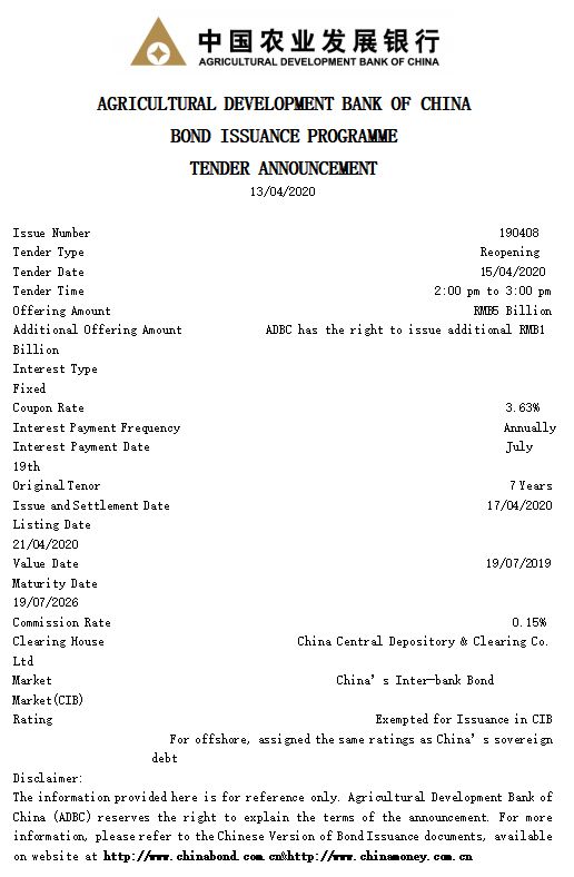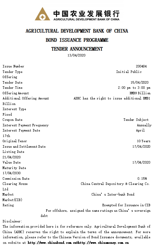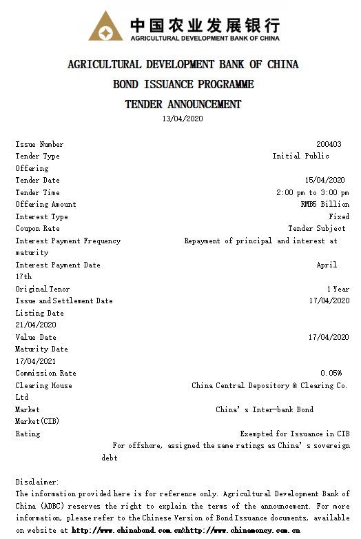 ADBC BOND ISSUANCE PROGRAMME TENDER ANNOUNCEMENT(Apr, 15th,2020)
