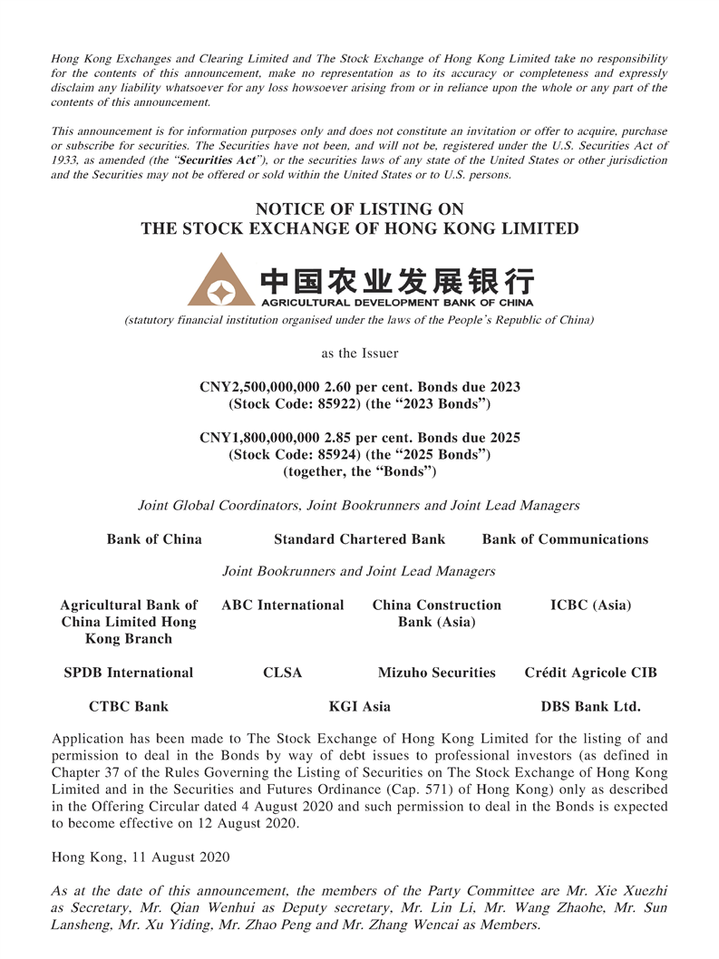 NOTICE OF LISTING ON THE STOCK EXCHANGE OF HONG KONG LIMITED