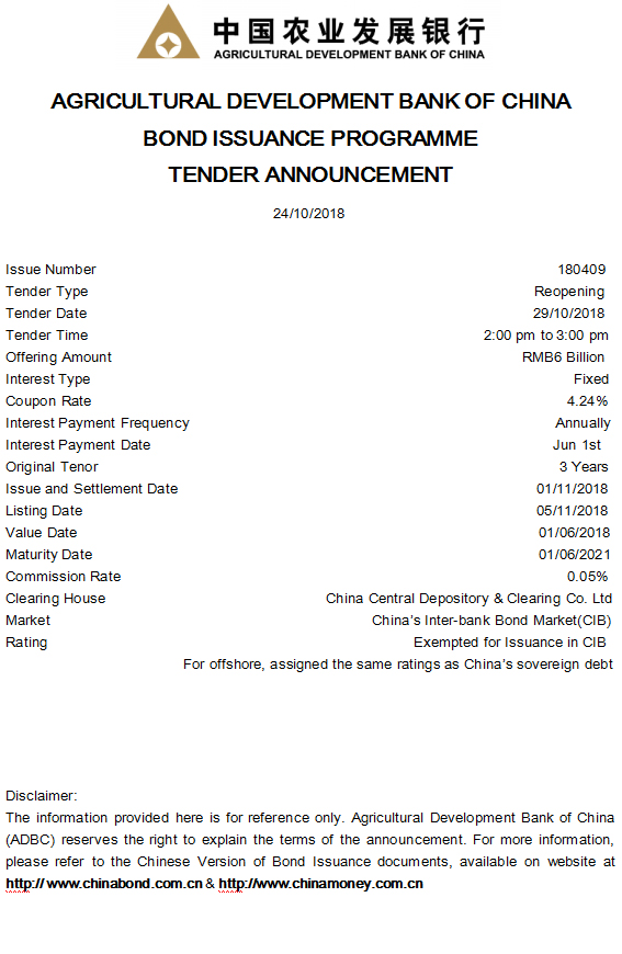 AGRICULTURAL DEVELOPMENT BANK OF CHINA BOND ISSUANCE PROGRAMME TENDER ANNOUNCEMENT(2018.10.29)