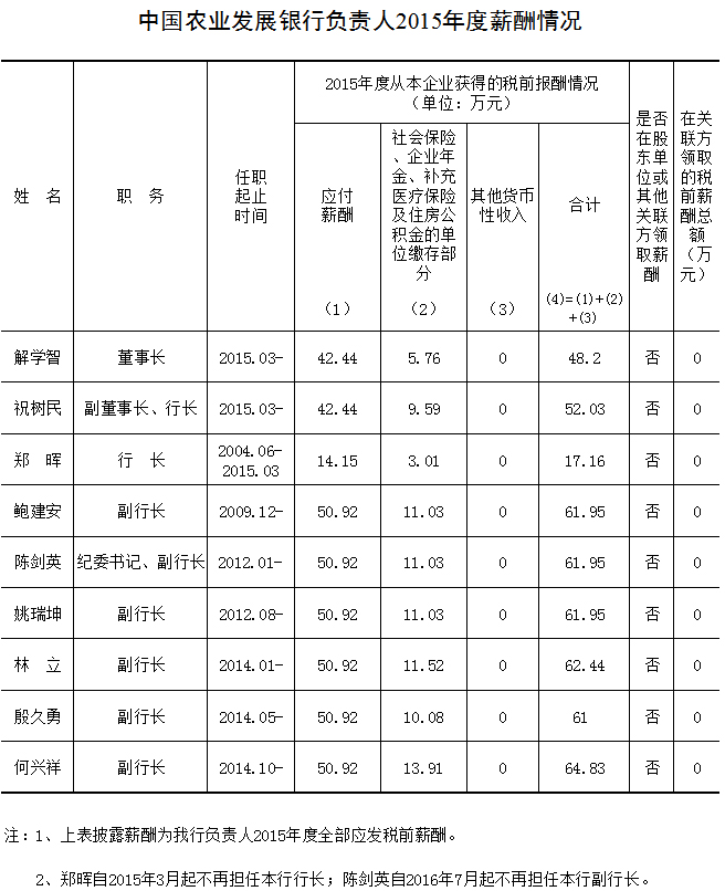 自2015年1月起,中國(guó)農(nóng)業(yè)發(fā)展銀行董事長(zhǎng)、行長(zhǎng)及其他副職負(fù)責(zé)人的薪酬,按照國(guó)家關(guān)于中央管理企業(yè)負(fù)責(zé)人薪酬制度改革的意見(jiàn)執(zhí)行。根據(jù)國(guó)家有關(guān)規(guī)定,現(xiàn)公開(kāi)披露中國(guó)農(nóng)業(yè)發(fā)展銀行負(fù)責(zé)人2015年度薪酬。