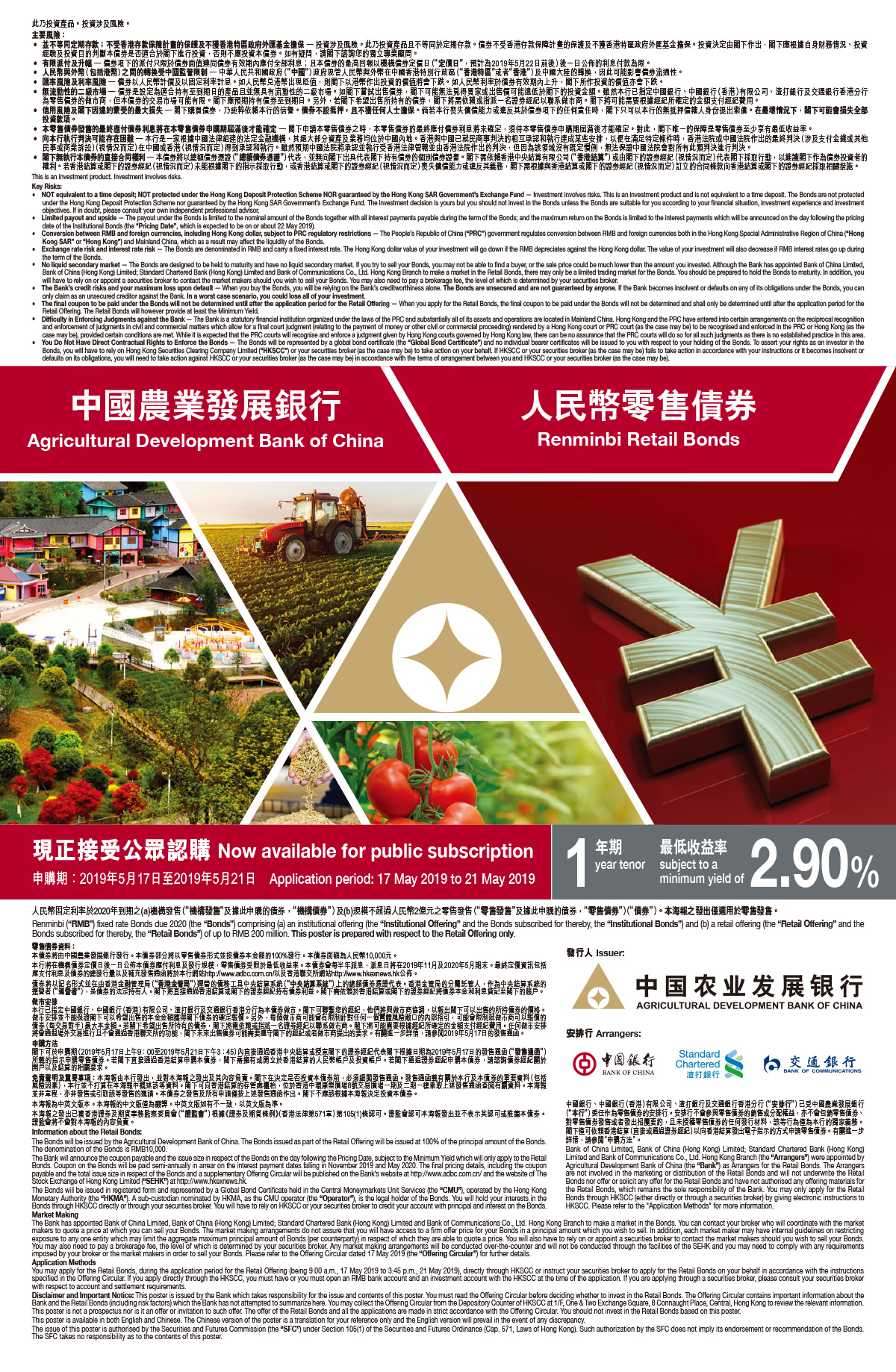 中國(guó)農(nóng)業(yè)發(fā)展銀行人民幣零售債券現(xiàn)正接受香港公眾認(rèn)購 AGRICULTURAL DEVELOPMENT BANK OF CHINA RENMINBI RETAIL BONDS - NOW AVAILABLE FOR HK PUBLIC SUBSCRIPTION