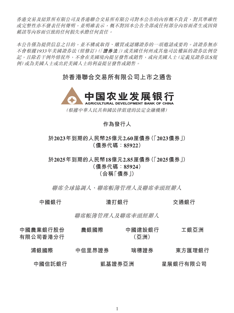 于香港聯(lián)合交易所有限公司上市的公告