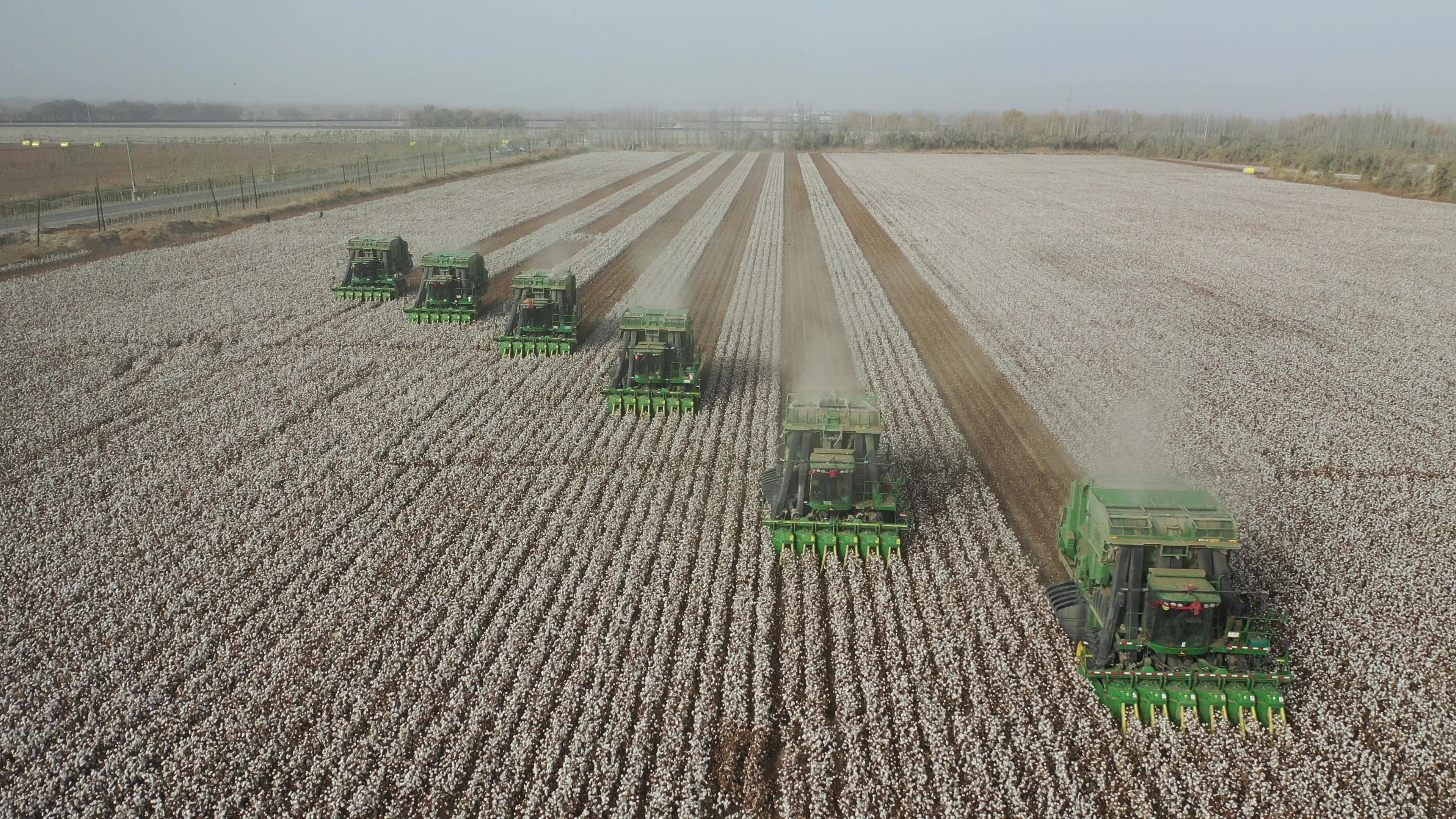 ▲巴州尉犁縣高標準棉田機械化收割場景