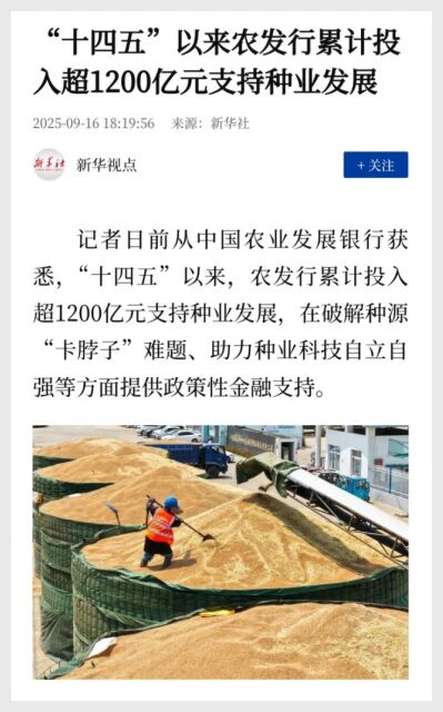 “十四五”以來農(nóng)發(fā)行累計投入超1200億元支持種業(yè)發(fā)展