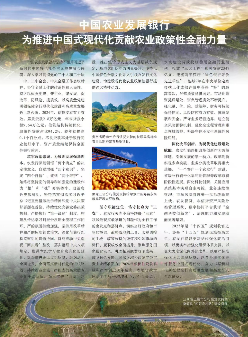 中國農(nóng)業(yè)發(fā)展銀行堅持不懈用習(xí)近平新時代中國特色社會主義思想凝心鑄魂,深入學(xué)習(xí)貫徹黨的二十大和二十屆二中、三中全會、中央金融工作會議精神,恪守金融工作的政治性和人民性,持之以恒強黨建、守主業(yè)、謀發(fā)展、促改革、防風(fēng)險、提質(zhì)效,以高質(zhì)量黨建引領(lǐng)保障全行現(xiàn)代化建設(shè)和高質(zhì)量發(fā)展邁上新臺階。2024年,信貸支農(nóng)有力有效,累放貸款2.8萬億元,年末貸款余額9.64萬億元;信貸結(jié)構(gòu)持續(xù)優(yōu)化,政策性貸款占比94.2%,較年初提高0.1個百分點;不良貸款率處于銀行同業(yè)較好水平,資產(chǎn)質(zhì)量繼續(xù)保持全國性銀行前列。