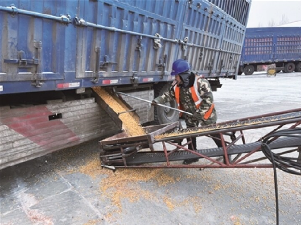 圖為鴻展生物科技有限公司工作人員在加班加點(diǎn)卸車轉(zhuǎn)運(yùn)糧食。本報(bào)記者 李丹琳 攝